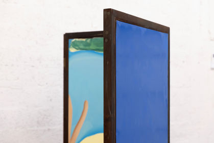 The body—its materiality and absence—is present as both object and subject in Michaela Mor’s works. “In deep grief, the body changes,” writes the artist, “the contours shift and sometimes there is a palpable sense of absence, as if a void has formed inside it that one continues to carry.” The painting is the physical materialization of memory, tracing what has been lost, but also the concreteness of the wounded life it left behind. The work “Heaven?” is a painted folding screen, which recalls both an abstract Matisse and ancient altar paintings. Next to it towers a totem of paintings that add up to form a female figure, or at least her limbs. In both works there is a desire to instill the painting with independence, movement, and agency.
